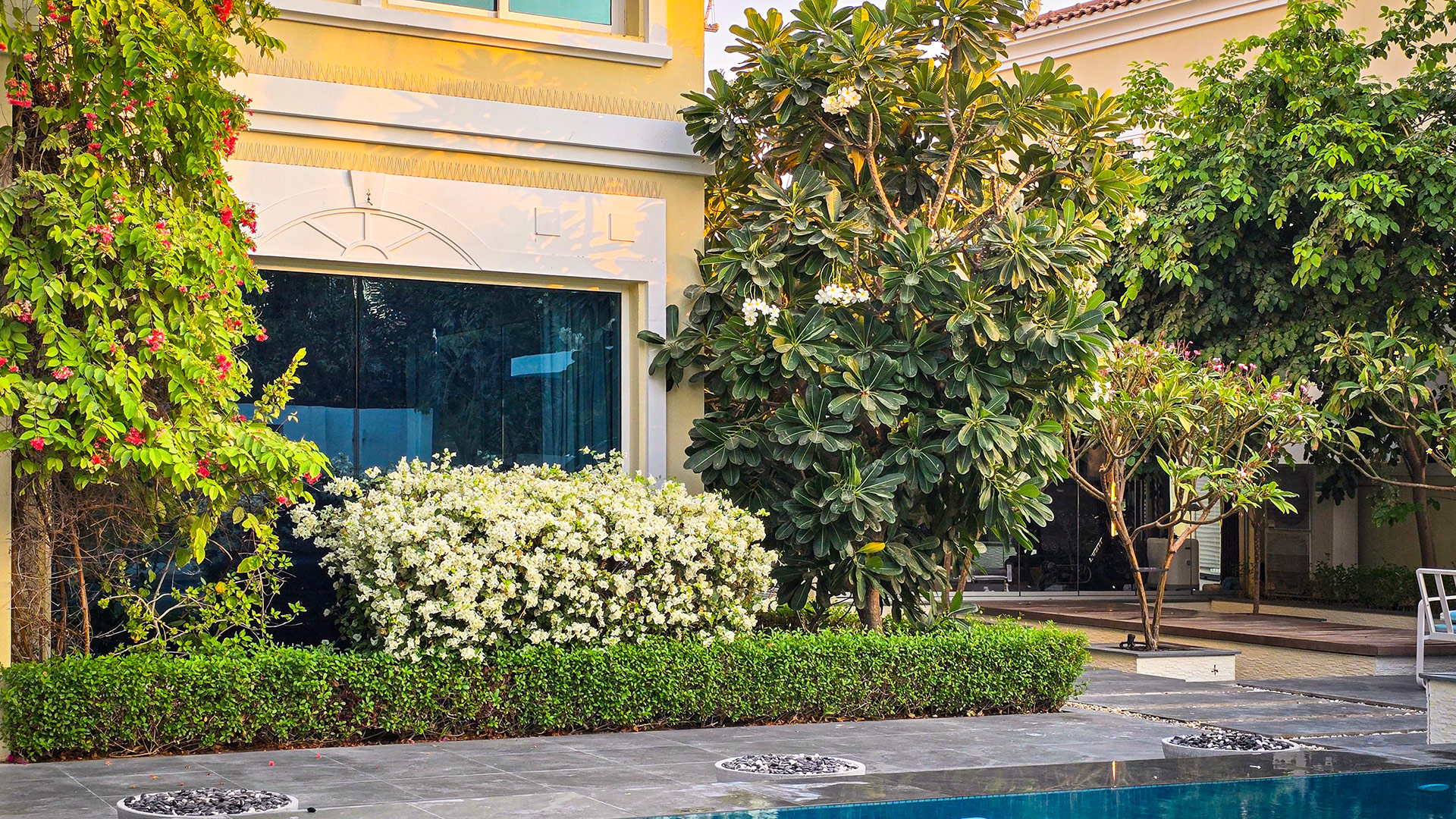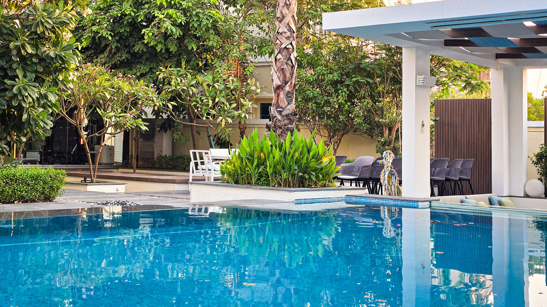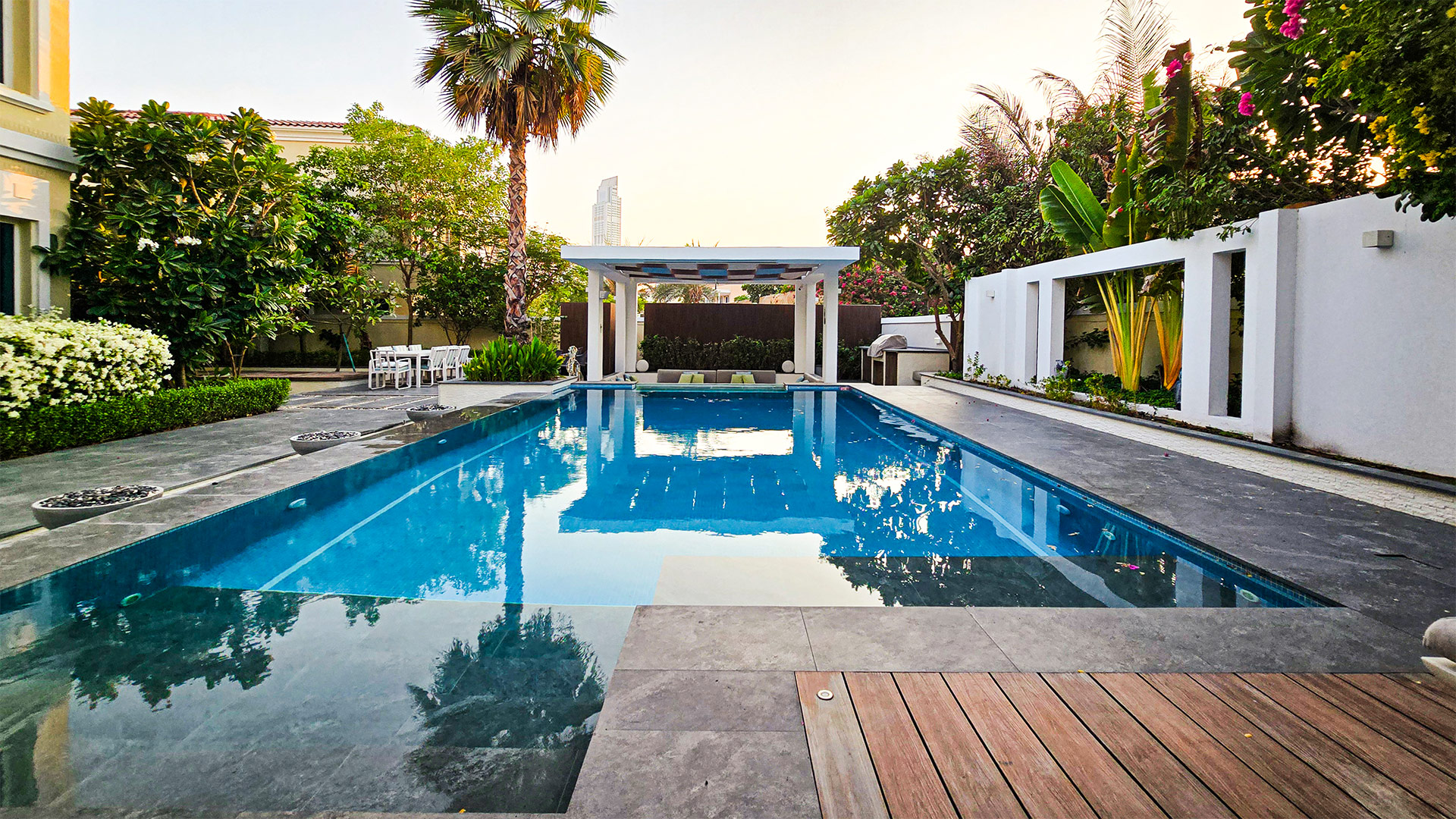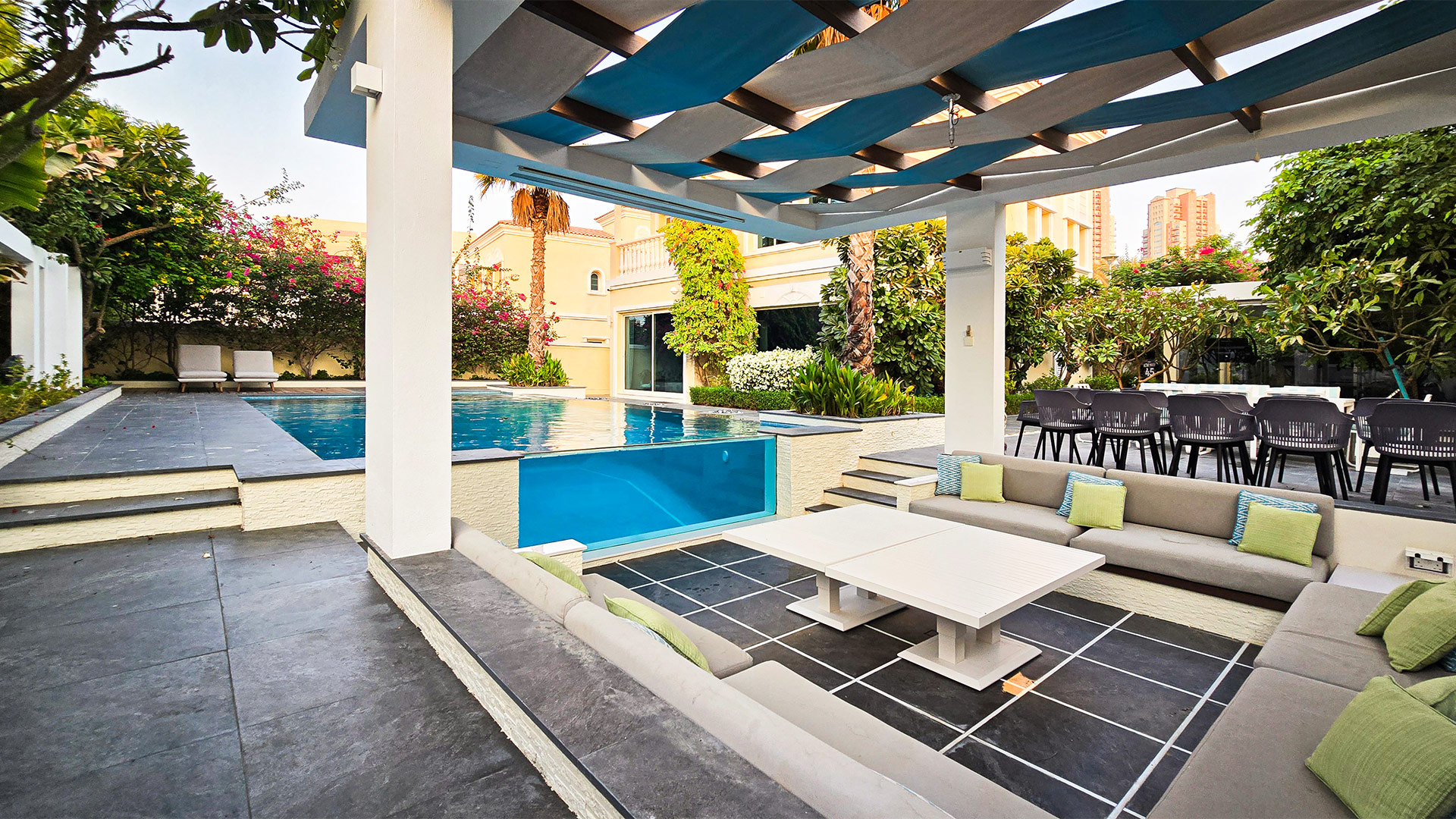 – Key Features/Highlights: infinity-edge pool, underwater glass panel, sunken lounge, shaded pergola, outdoor dining, lush landscaping, modern design