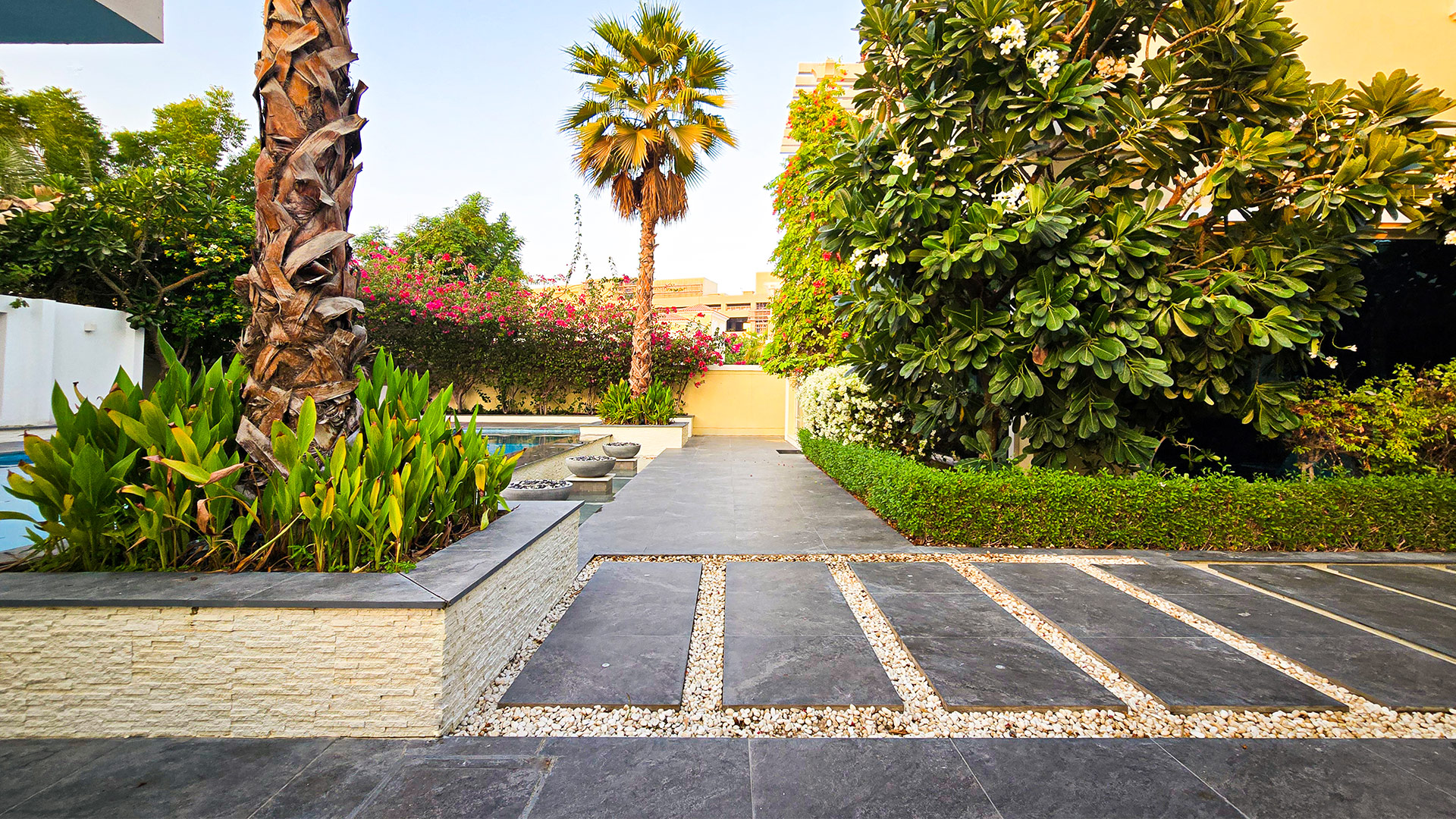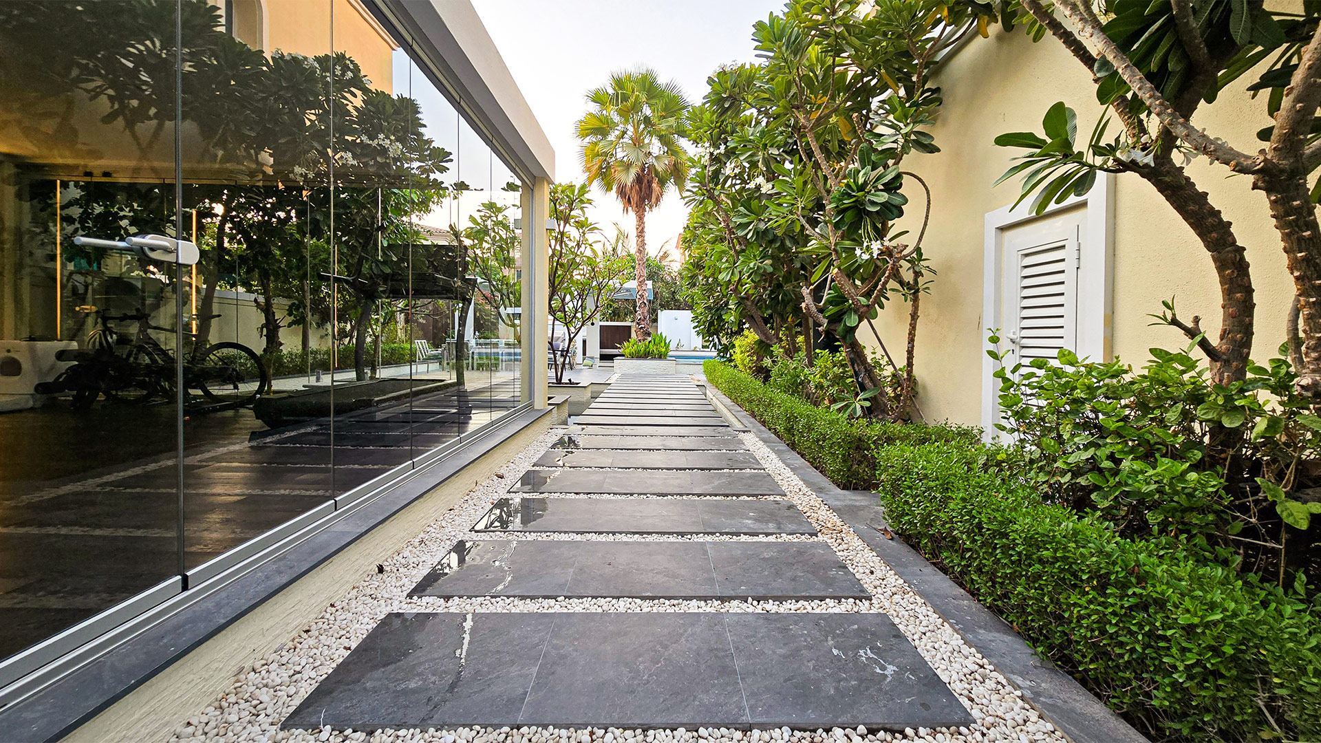For this JVT Strict 5 villa, we designed an outdoor environment that redefines luxurious living and entertaining. Our goal was to create a multi-functional landscape that effortlessly transitions from serene relaxation to vibrant social gatherings. The modern pool, complete with its captivating glass viewing panel, anchors the space, while the integrated sunken lounge provides a chic area for conversation. Strategic shading, ambient lighting, and elegant dining zones complete this.