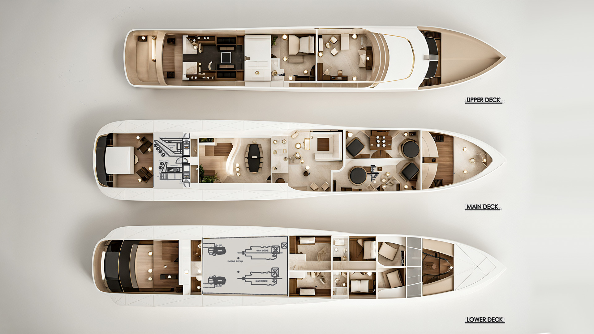 For the Spanish Queen Yacht, our interior design vision was to create not just a vessel, but a floating masterpiece of innovation and comfort. We pushed boundaries to integrate unique elements, such as the mesmerizing custom underwater viewing panel in the main dining area, bringing the marine world directly into the luxury interior. The design employs a sophisticated material palette of rich woods, plush textiles, and sleek metallics, ensuring every cabin, from the expansive dining salon to the intimate staterooms, offers both aesthetic pleasure and superior functionality. This project represents the pinnacle of maritime interior design, delivering an extraordinary journey for its discerning owners.