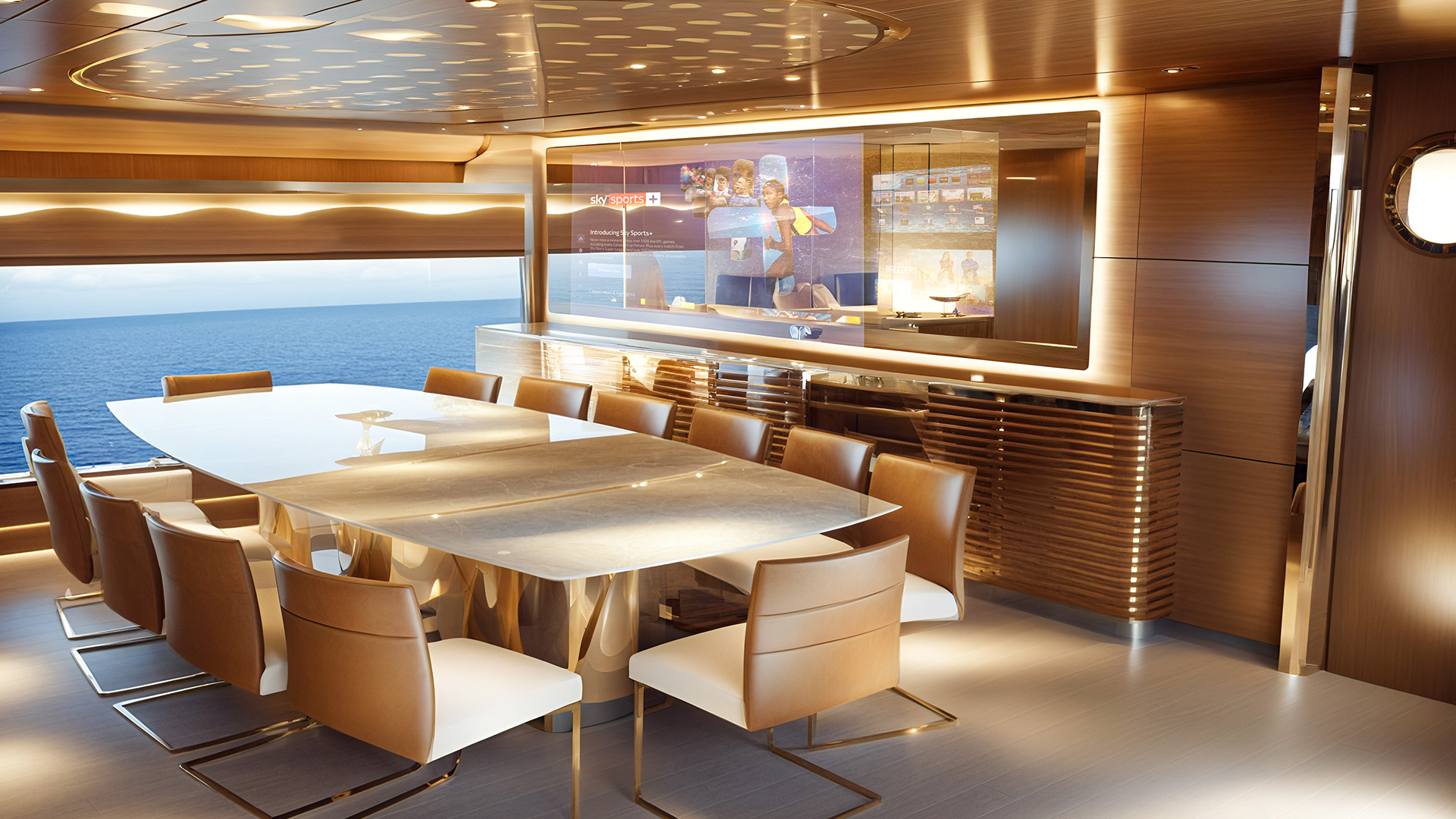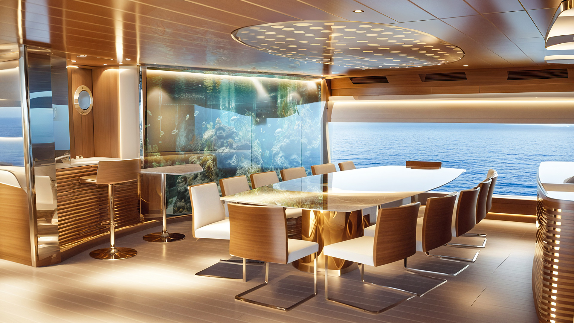 – Key Features/Highlights: Custom dining table, underwater viewing panel/art, rich wood paneling, warm metallic accents, bespoke furniture, circular bed, panoramic windows, luxurious finishes, sophisticated lighting